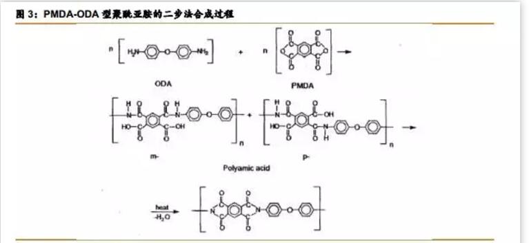 ● 二步法是目前合成聚酰亞胺最普遍采用的方法,包括由二酐和二胺在非質(zhì)子極性溶劑中低溫縮聚得到前體聚酰胺酸及脫水環(huán)化得到聚酰亞胺兩步。